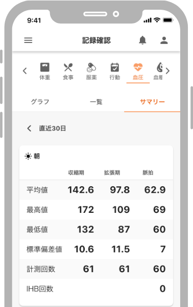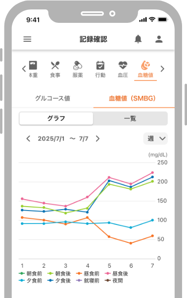 血圧や血糖値(SMBG)、グルコース値、体重、運動などのデータを、それぞれのサービスから連携することで、測定時のデータを自動的にアプリに記録することができ、収集されたデータは医師と共有することが可能で健康管理や生活習慣の改善・治療にお役立ていただけます。